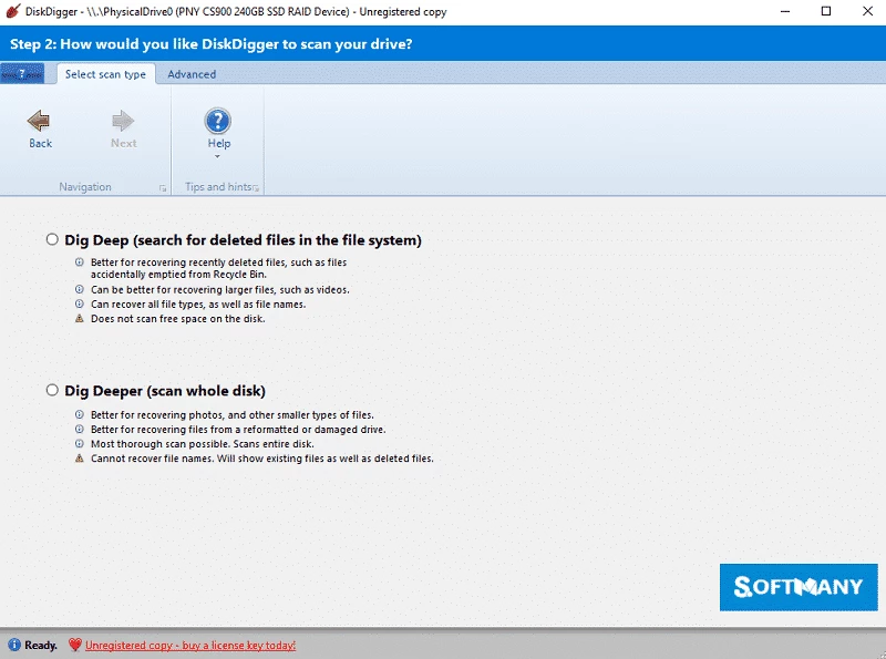 A interface minimalista oferece um procedimento simples para selecionar a unidade e o modo de recuperação. Portanto, a interface não é moderna, mas é funcional e fácil de navegar. Você encontrará dois tipos de modo de recuperação e poderá iniciar o processo de verificação. Visualize os arquivos recuperáveis exibidos e selecione o local para restaurar seus arquivos perdidos.
